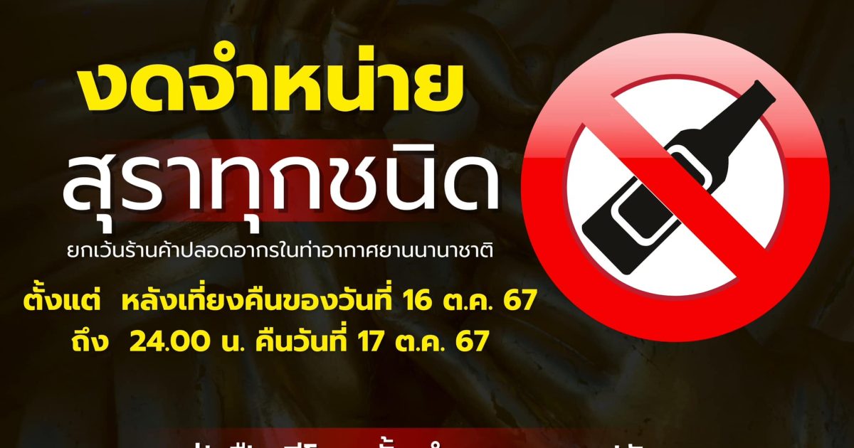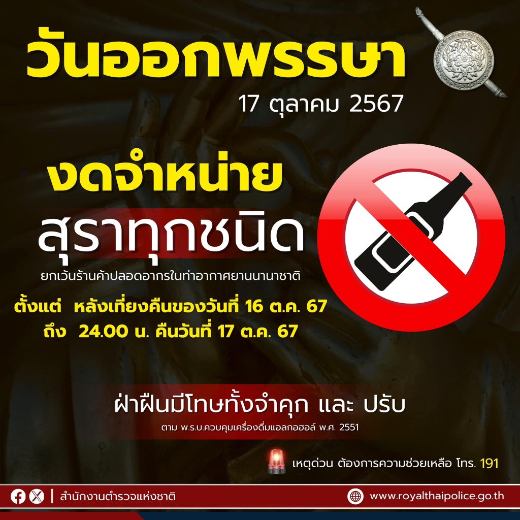 วันออกพรรษา งดจำหน่ายสุราทุกชนิด 17 ตุลาคม 2567 โดย admin / ข่าวประชาสัมพันธ์ วันออกพรรษา 17 ตุลาคม 2567งดจำหน่ายสุราทุกชนิด ฝ่าฝืนมีความผิดตามกฎหมายด้วยความปรารถนาดีจาก “สำนักงานตำรวจแห่งชาติ” FacebookFacebookXXLINELine