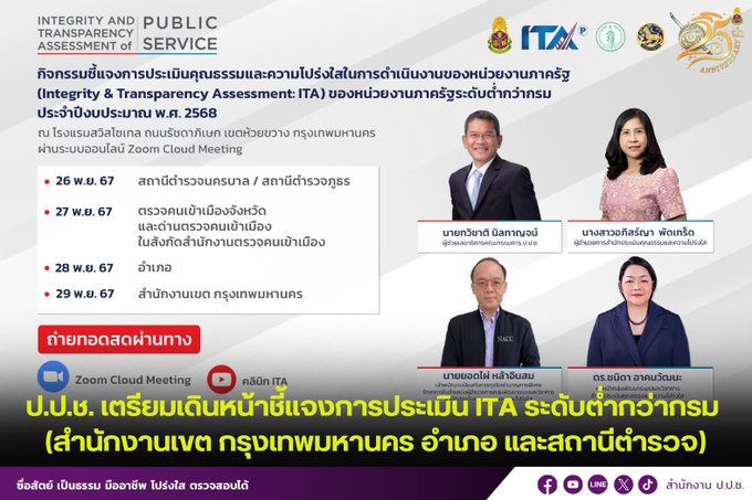 ในระหว่างวันที่ 26 – 29 พฤศจิกายน 2567 สำนักงาน ป.ป.ช. โดย สำนักประเมินคุณธรรมและความโปร่งใส จะจัดกิจกรรมชี้แจงการประเมินคุณธรรมและความโปร่งใสในการดำเนินงานของหน่วยงานภาครัฐ (Integrity & Transparency Assessment: ITA) ของหน่วยงานระดับต่ำกว่ากรม จำนวน 4 วัน โดยผ่านระบบ Zoom Cloud Meeting ดังนี้
