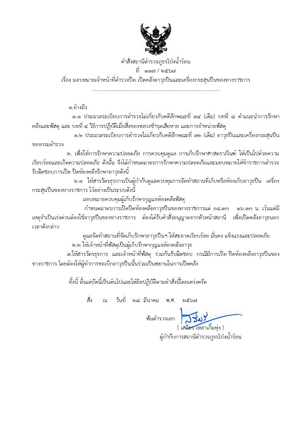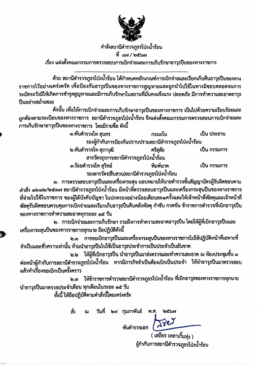 พ.ต.อ.เสถียร เหลาเกิ้มหุ่ง ผกก.สภ.โป่งน้ำร้อน มอบหมายให้ พ.ต.ท.สุนทร กะมะโน รอง ผกก.ป.สภ.โป่งน้ำร้อน, พ.ต.ท.สมศักดื์ ฝ่ายเตย สวป.สภ.โป่งน้ำร้อน, พ.ต.ท.สุภาวุฒิ ศรีสุลัย สว.ธร.สภ.โป่งน้ำร้อน พร้อมด้วยคณะกรรมการตรวจสอบพัสดุฯ ได้เรียกตรวจอาวุธปืนหลวงของทางราชการที่มีอยู่ในคลังและที่ได้รับการเบิกจ่ายให้แก่ข้าราชการตำรวจในการปฎิบัติหน้าที่