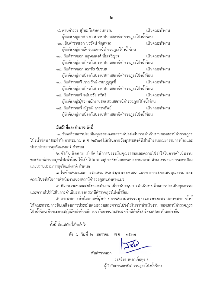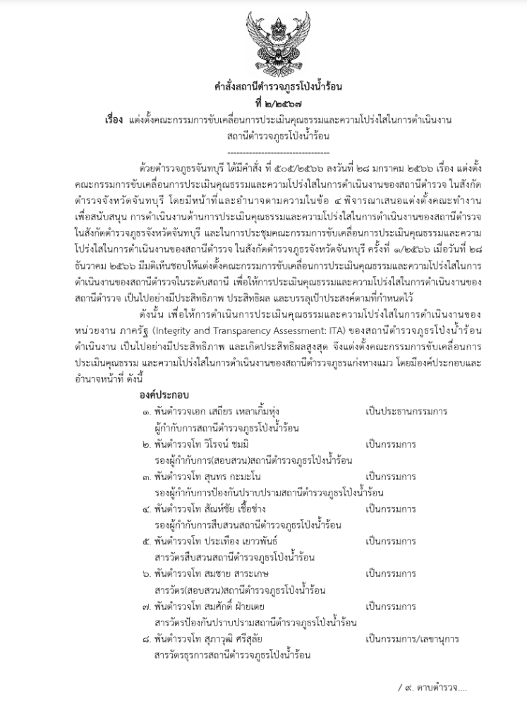 • คำสั่งแต่งตั้งคณะทำงานขับเคลื่อนและกำกับติดตามการประเมินคุณธรรมและความโปร่งใสในการดำเนินงานของหน่วยงานภาครัฐ (Integrity and Transparency Assessment : ITA) ระดับสถานีตำรวจปีงบประมาณ 2567 คลิ๊กที่นี่