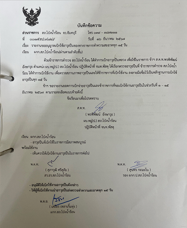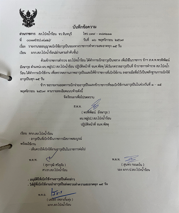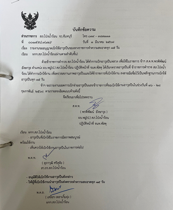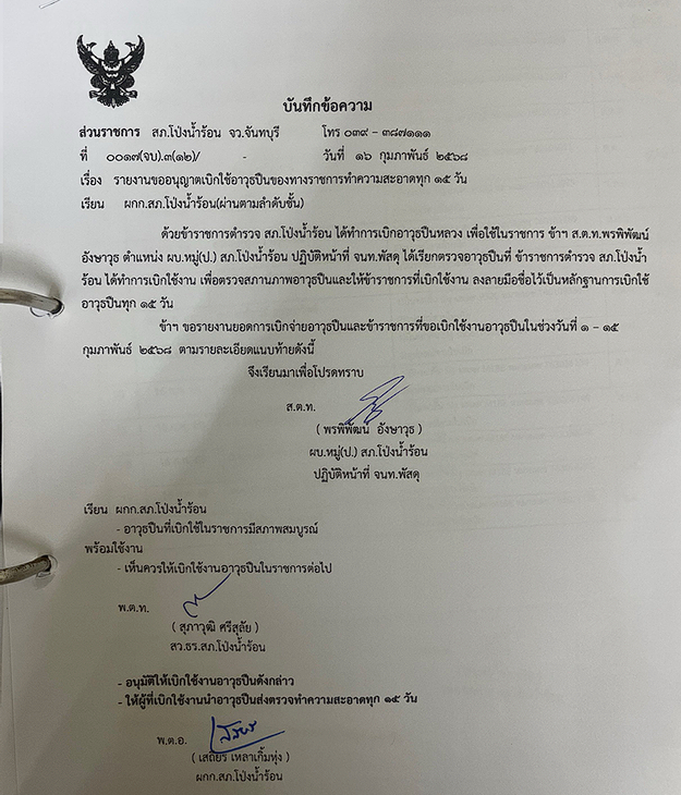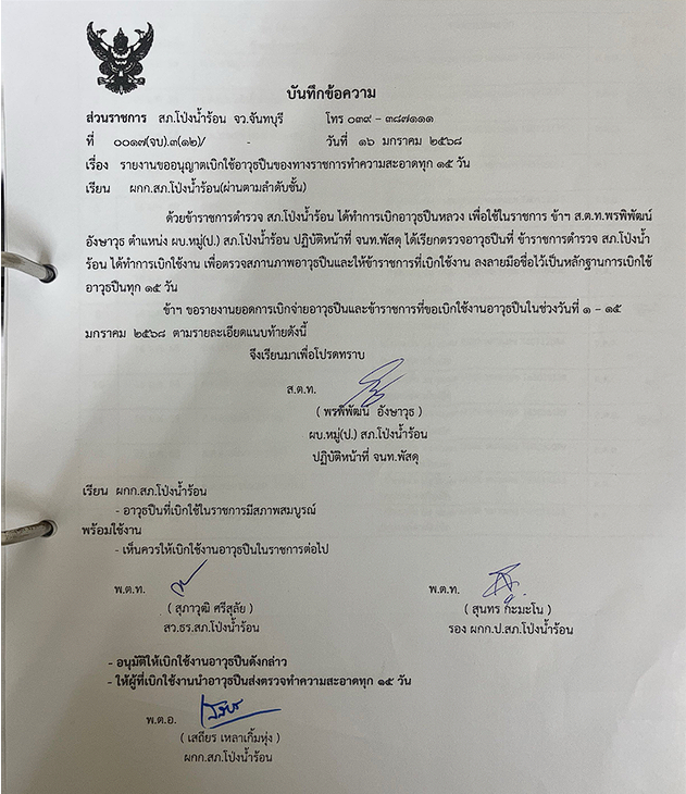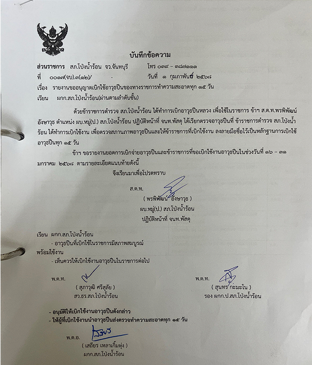พ.ต.อ.เสถียร เหลาเกิ้มหุ่ง ผกก.สภ.โป่งน้ำร้อน มอบหมายให้ พ.ต.ท.สุนทร กะมะโน รอง ผกก.ป.สภ.โป่งน้ำร้อน, พ.ต.ท.สมศักดื์ ฝ่ายเตย สวป.สภ.โป่งน้ำร้อน, พ.ต.ท.สุภาวุฒิ ศรีสุลัย สว.ธร.สภ.โป่งน้ำร้อน พร้อมด้วยคณะกรรมการตรวจสอบพัสดุฯ ได้เรียกตรวจอาวุธปืนหลวงของทางราชการที่มีอยู่ในคลังและที่ได้รับการเบิกจ่ายให้แก่ข้าราชการตำรวจในการปฎิบัติหน้าที่
